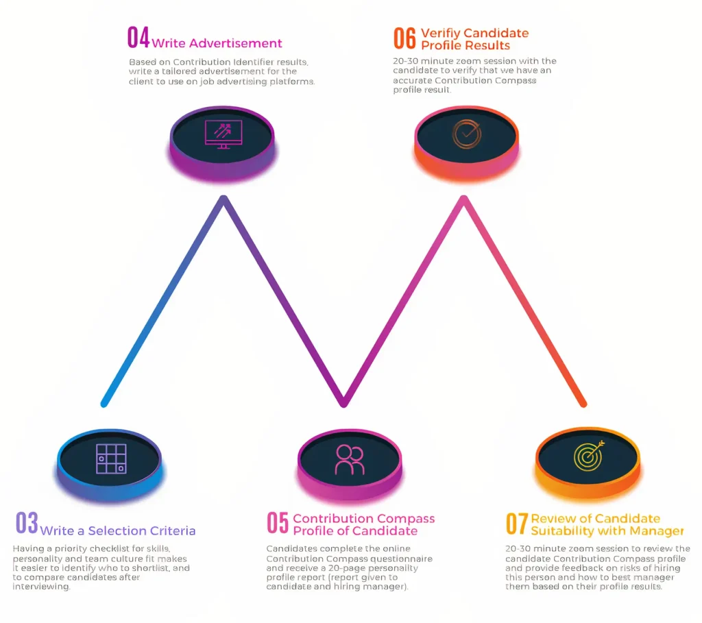 When you have identified your top picks, we will personality profile them for you. Using Contribution Compass profiling, we identify each candidate’s personality profile using our 96 data point profiling system, verify the results with them and then provide you with a detailed description of green flag,s potential red flags, how to best manage them, and what to do to support them in their onboarding process.